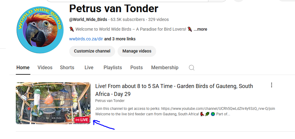 My YouTube live stream is up and running. It is called Live! From about 8 to 5 SA Time – Garden Birds of Gauteng, South Africa. Please pop in, leave a comment in the chat, and like the stream. Would so much appreciate it.